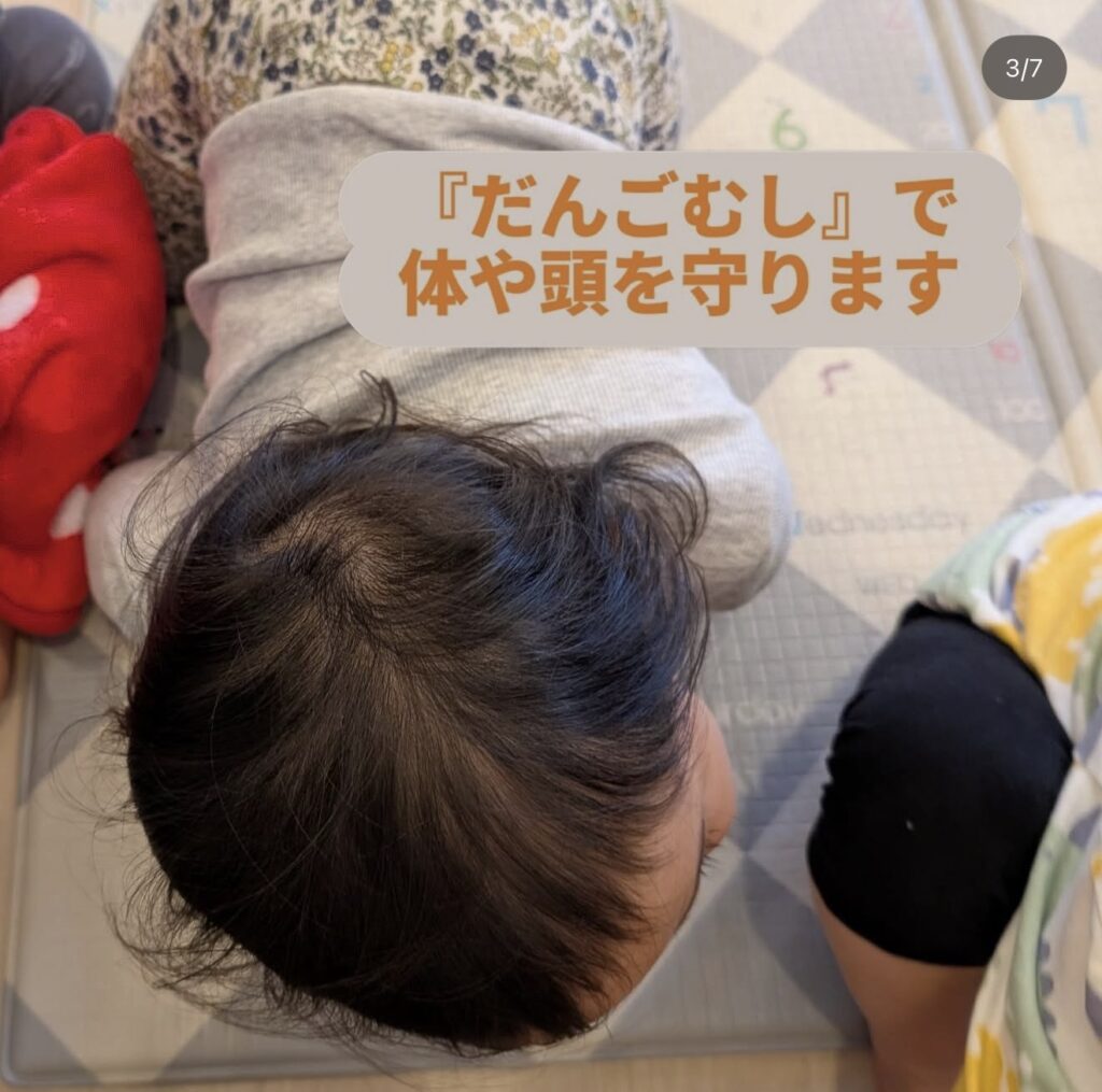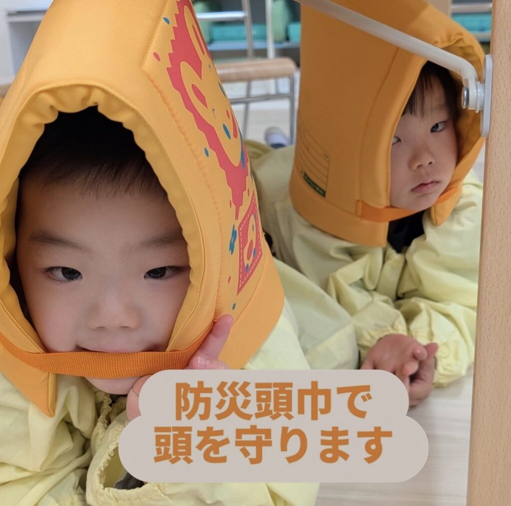 • つき・たいよう組は防災頭巾をすばやくかぶることができました!