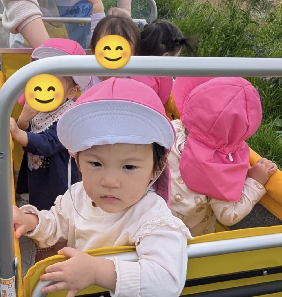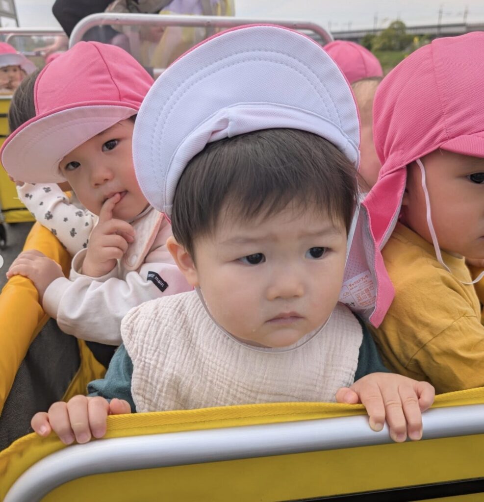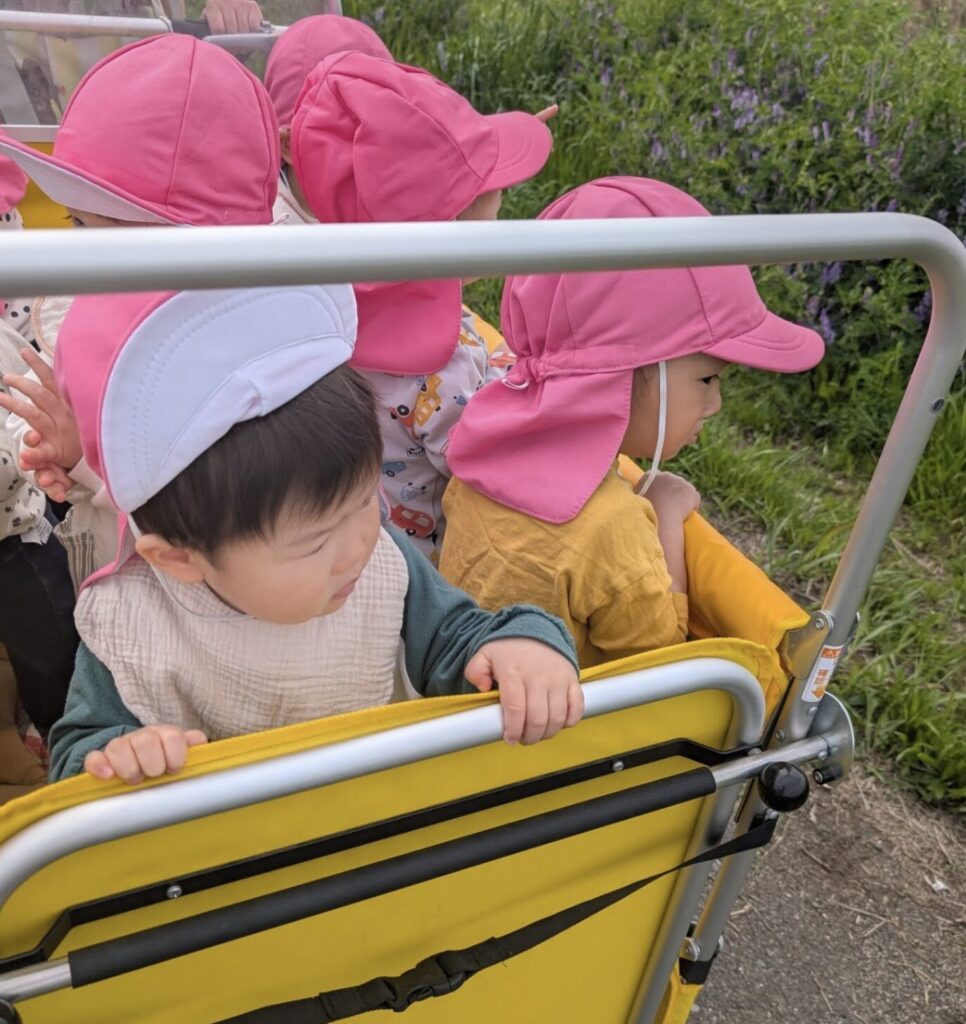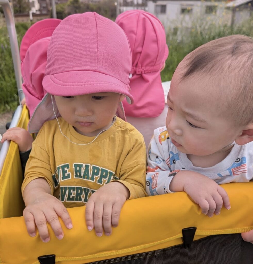 にじ組の新入のこどもたちも戸外に出て気持ち良い風にあたったり、飛行機を見つけたりして気分が穏やかになった様子です