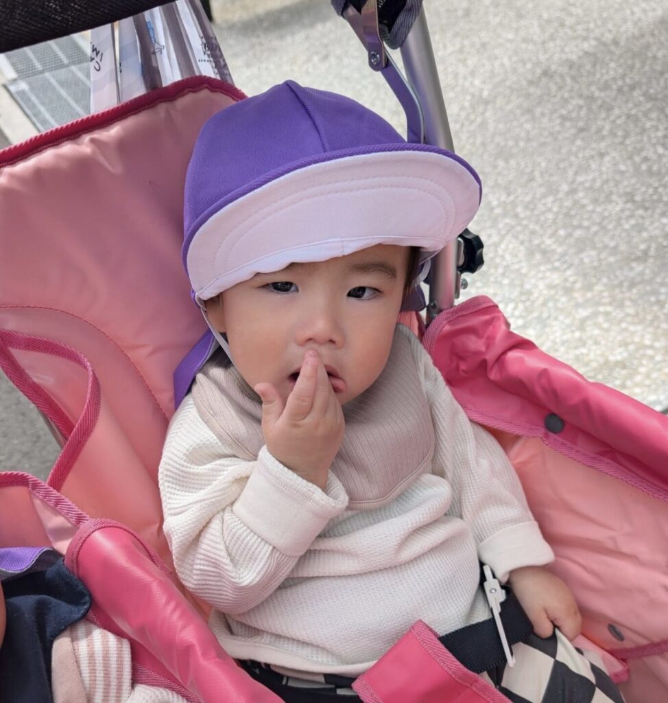初めてのカラー帽子とバギーに少し戸惑っていましたが、バギーが動き始めると心地よい振動にすやすや眠っていました!